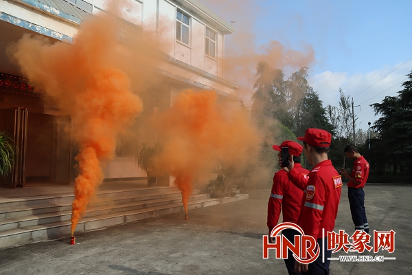 楼道前,县污水处理厂邀请神州救援队专业人员拉开了消防演习烟雾罐,黄色的浓烟瞬间笼罩了整座楼,持续了大约3分多钟时间。一至三楼人员撤离完毕后,应急抢险监护组长清点了一下人数。